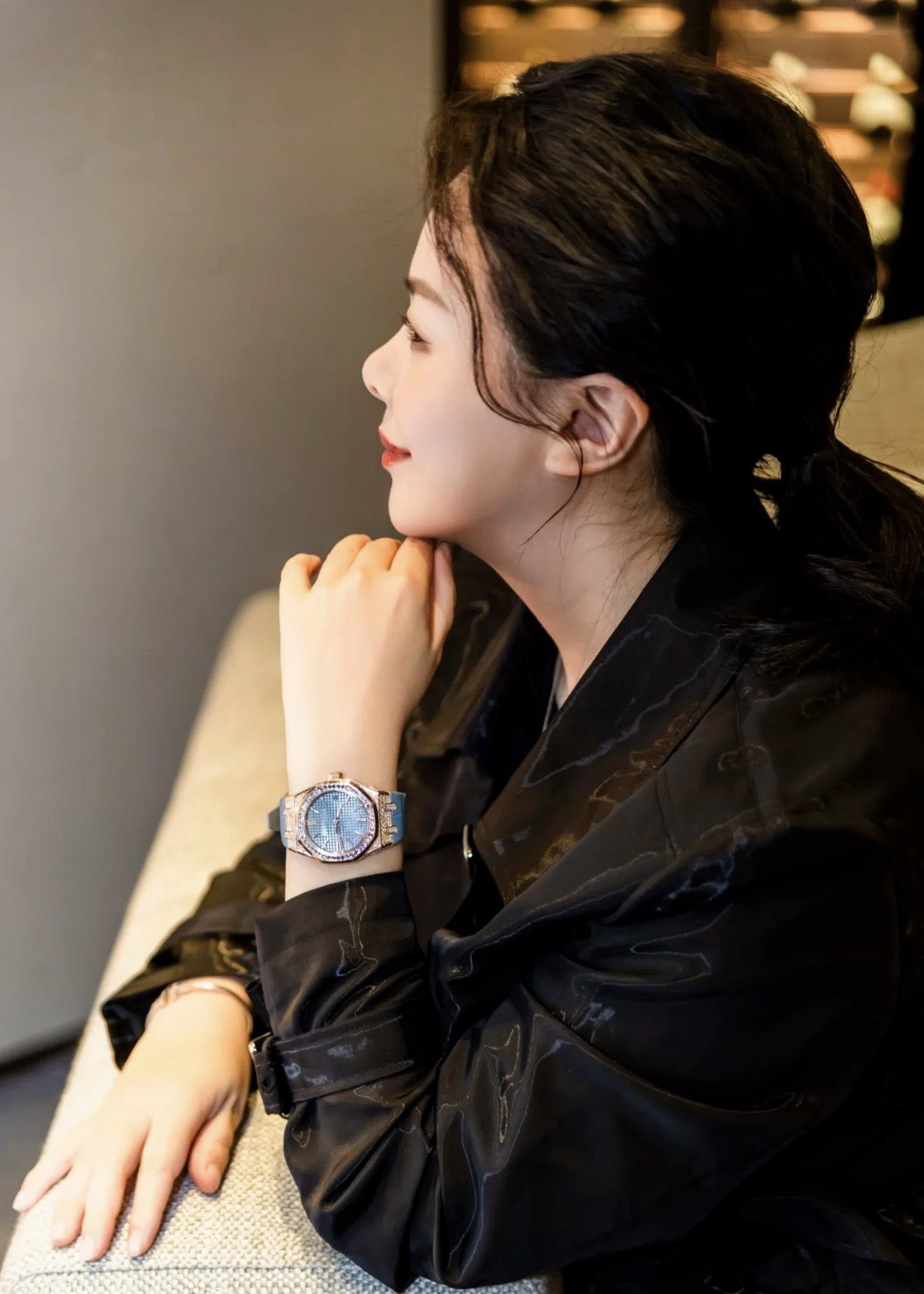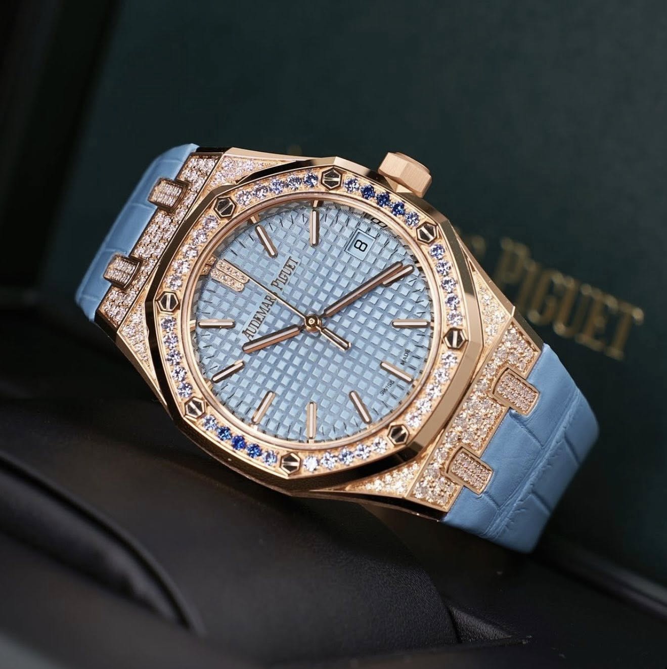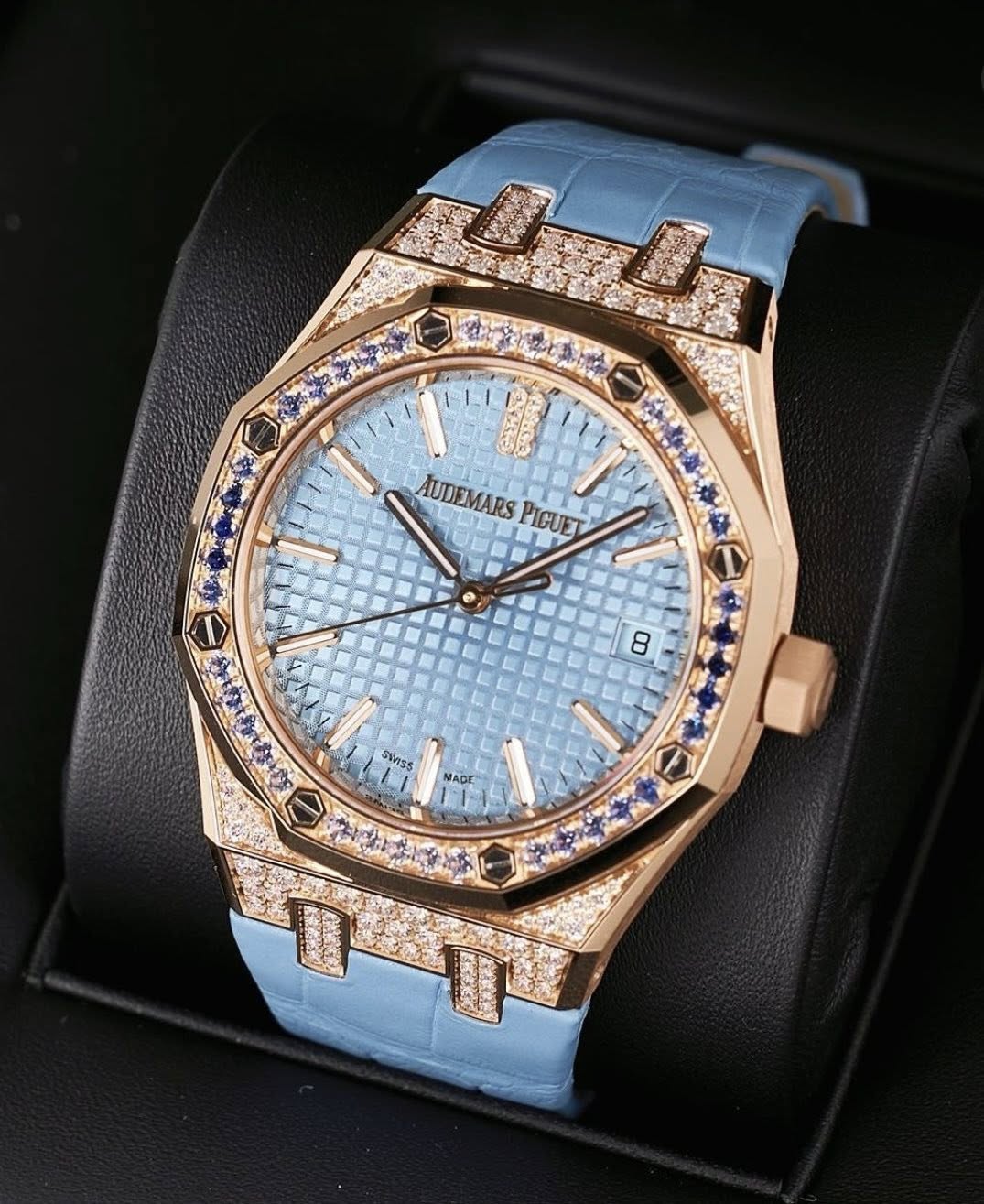 Sở hữu kích thước 37mm, bộ vỏ vàng hồng 18K giữ trọn tinh thần Royal Oak với vành bezel bát giác cùng 8 đinh vít đặc trưng. Tuy nhiên, điểm khiến mẫu đồng hồ này thực sự khác biệt nằm ở nghệ thuật nạm kim cương tinh xảo: từ bezel đến các chi tiết trên mặt số đều được đính kim cương brilliant-cut, tạo nên hiệu ứng ánh sáng rực rỡ nhưng vẫn tinh tế, không phô trương.