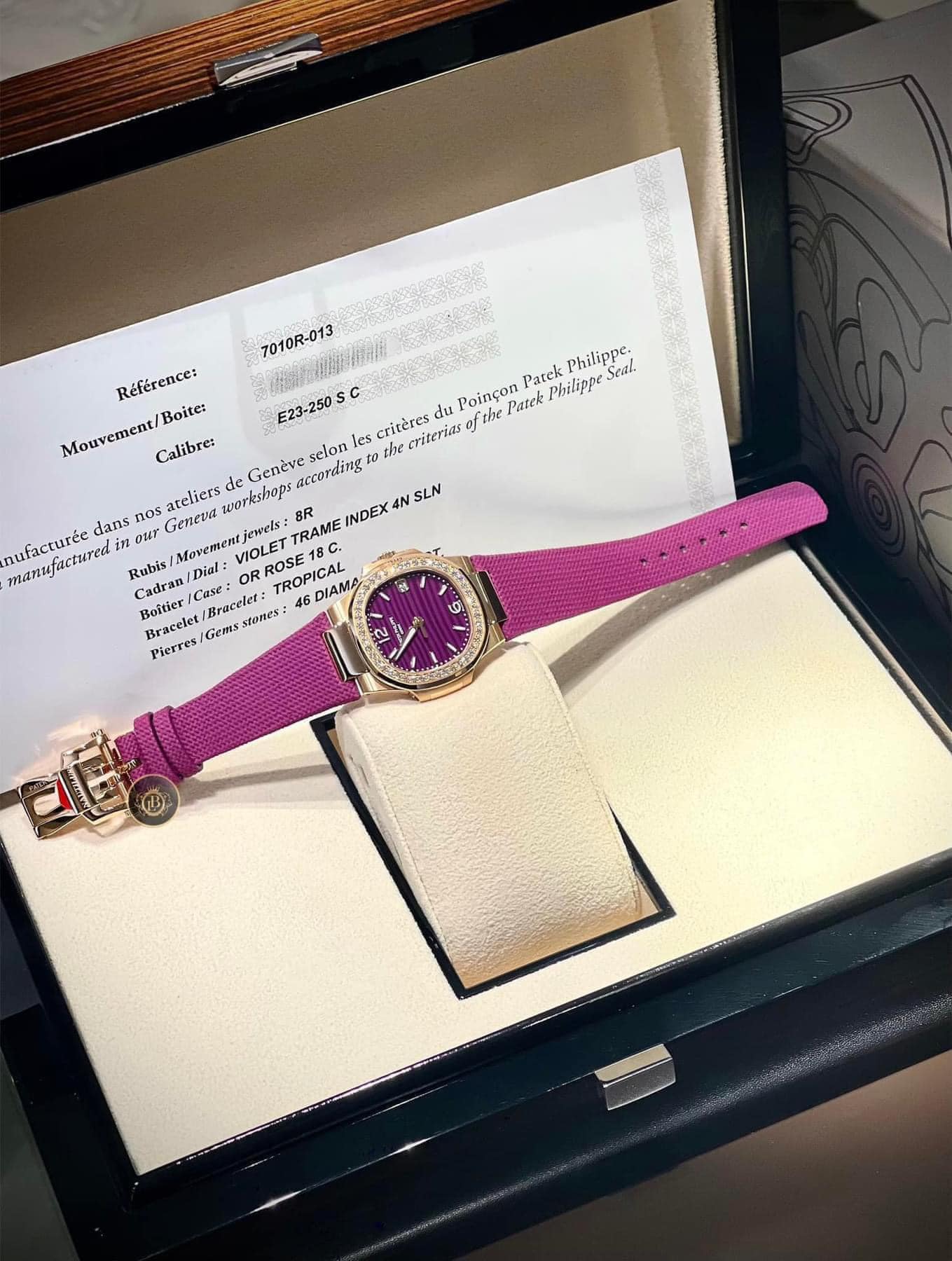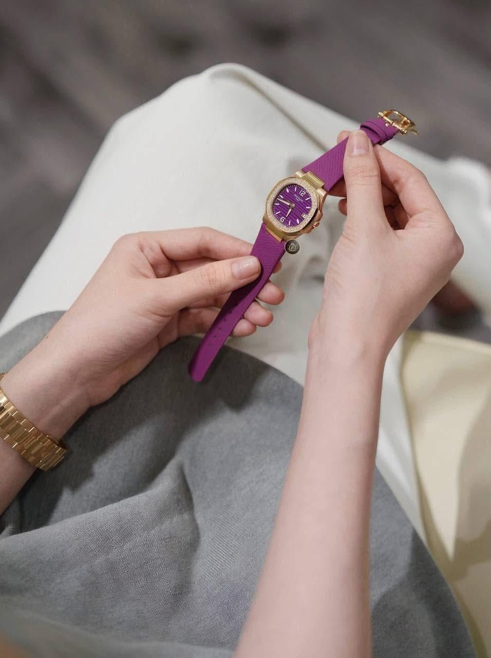 Để gia tăng sự quyến rũ cho chiếc đồng hồ này không gì khác chính là 46 viên kim cương đính đều vừa vặn trên vành bezel. Những viên kim cương trắng được các nghệ nhân lựa chọn kỹ lưỡng đảm bảo độ tinh khiết cũng như có khả năng bắt sáng ưu việt nhất. Phối hợp ăn ý với bộ vỏ khung bằng vàng hồng của cỗ máy Patek Philippe Nautilus 7010R-013 là dây đeo bằng vải cực kỳ độc đáo và mới mẻ, tone sur tone với màu mặt số của đồng hồ.
