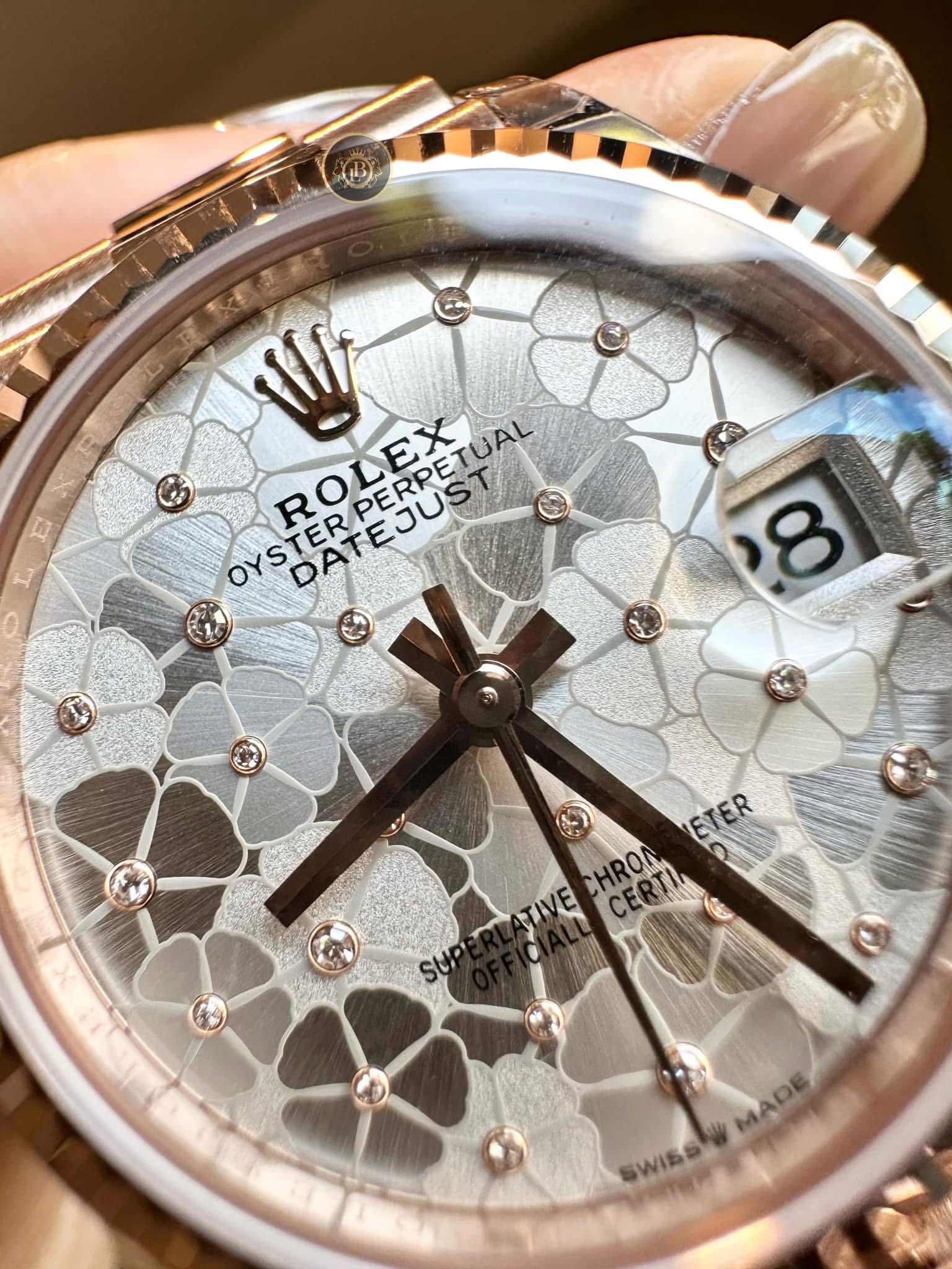 Bên cạnh điểm nhấn là mặt số “Floral Motif”, mặt số của Rolex Datejust 278275-0045 vẫn sở hữu một số chi tiết quen thuộc của dòng Datejust như bộ kim baton, thấu kính lịch ngày cyclops ở vị trí 3 giờ và logo thương hiệu ở bên dưới vị trí 12 giờ. Chức năng chỉ giờ và lịch ngày có thể được điều chỉnh qua núm vặn tại giờ phải của đồng hồ.