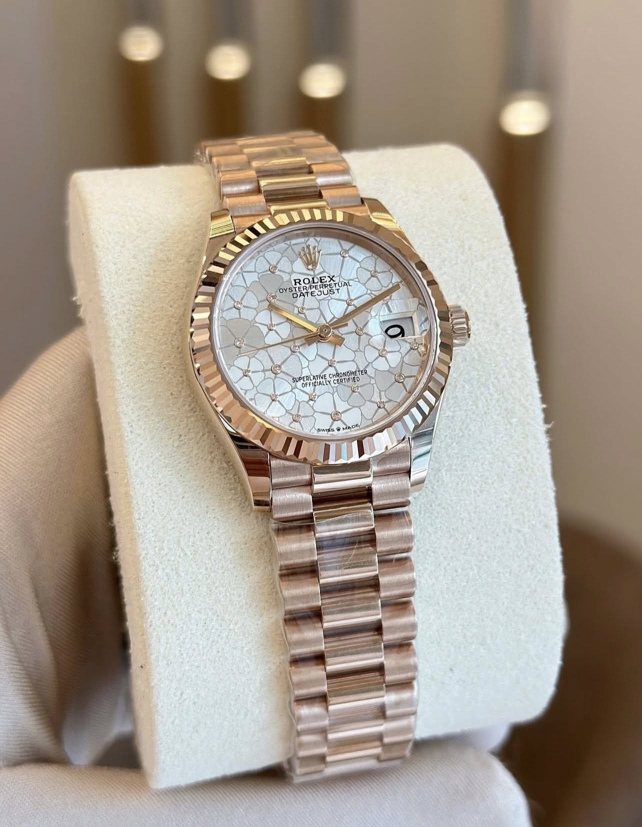 Rolex Datejust 278275-0045 sở hữu bộ vỏ được làm bằng chất liệu vàng Everose 18K, đường kính 31mm. Vành bezel kiểu khía rãnh giúp phản chiếu ánh sáng và tăng sự bắt mắt cho mặt số phía trong. Mặt số này bao gồm 24 bông hoa với các lớp phủ hoàn thiện khác nhau: phủ tia mặt trời, lớp phủ mờ và lớp phủ sần. Trong đó, mỗi bông hoa đều được thắp sáng từ bên trong bởi một viên kim cương đặt tại chính giữa, thổi bùng lên nguồn năng lượng tươi mới và thu hút người nhìn.