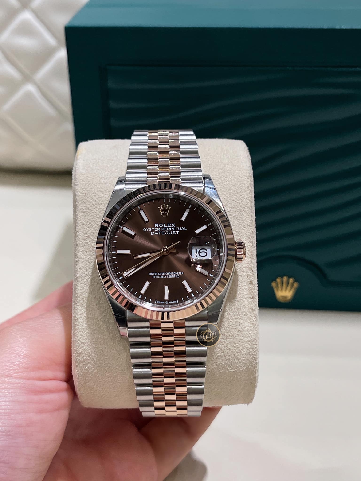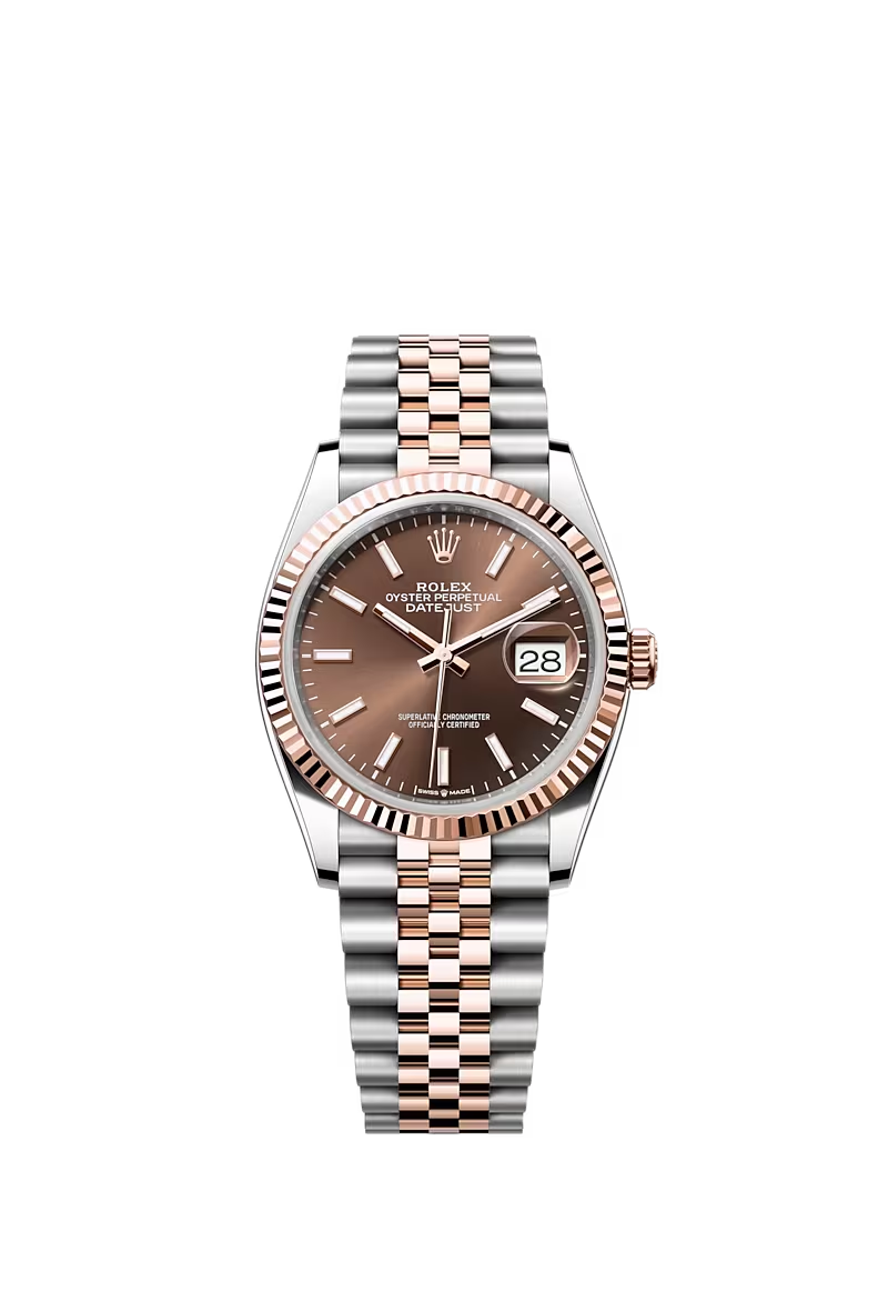 Mẫu đồng hồ có kích thước 36mm và một mặt số tròn bên trong. Mặt số đã được chế tác trong màu nâu, nay còn được hoàn thiện bằng phương phát chải tia đem đến cái nhìn hấp dẫn. Trên mặt số cao cấp của Datejust 36 126231-0043 là 10 cọc chỉ giờ dáng baton gọn gàng bằng vàng hồng, nay được phủ thêm chất phát quang mang tên Chromalight. Mẫu đồng hồ có thêm khả năng báo giờ nhờ ô cửa sổ được đặt tại góc 3 giờ.