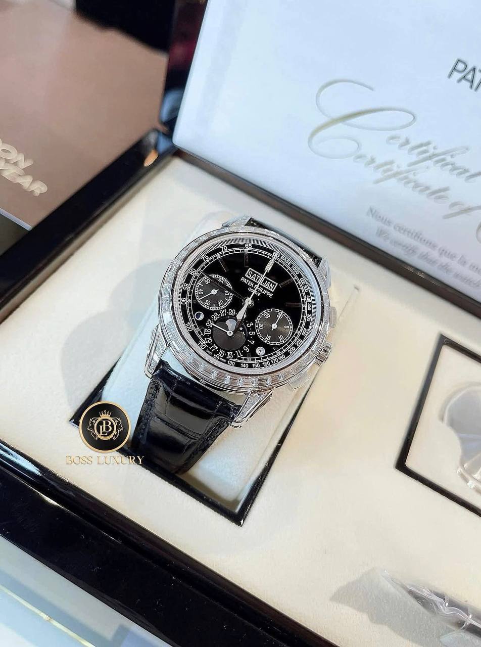 Mặt số đen lacquer sâu, bố cục cổ điển với thang tachymeter và các mặt số phụ được sắp xếp hài hòa, giữ nguyên tinh thần truyền thống của dòng perpetual calendar chronograph, đồng thời tạo chiều sâu thị giác rõ rệt.