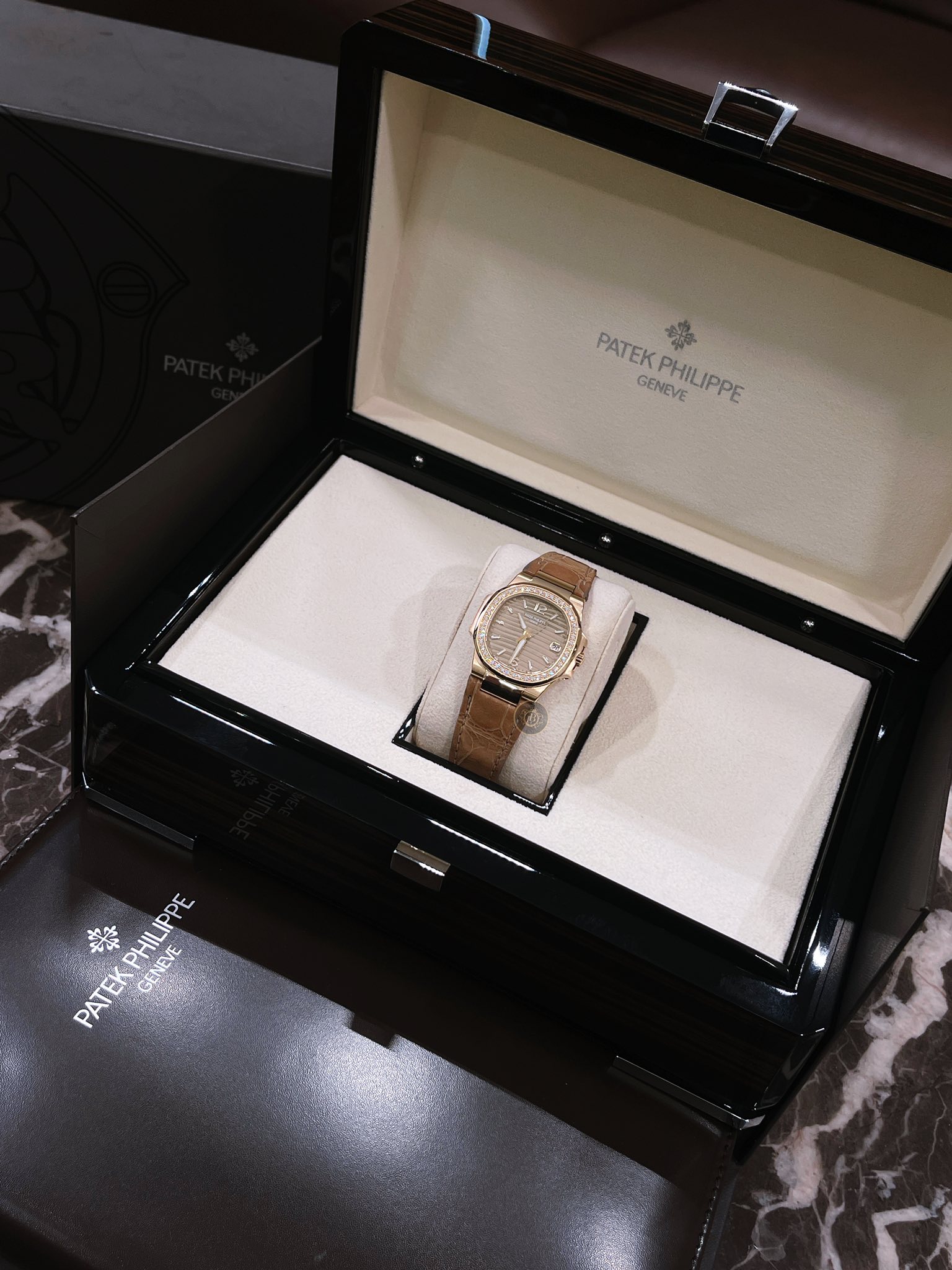 Để gia tăng sự quyến rũ cho chiếc đồng hồ này không gì khác chính là 46 viên kim cương đính đều vừa vặn trên vành bezel. Những viên kim cương trắng được các nghệ nhân lựa chọn kỹ lưỡng đảm bảo độ tinh khiết cũng như có khả năng bắt sáng ưu việt nhất. Phối hợp ăn ý với bộ vỏ khung bằng vàng hồng của cỗ máy Patek Philippe Nautilus 7010R-012 là dây đeo màu beige cực kỳ độc đáo, cực kỳ mới mẻ vốn được may thủ công một cách chi tiết và cẩn thận.