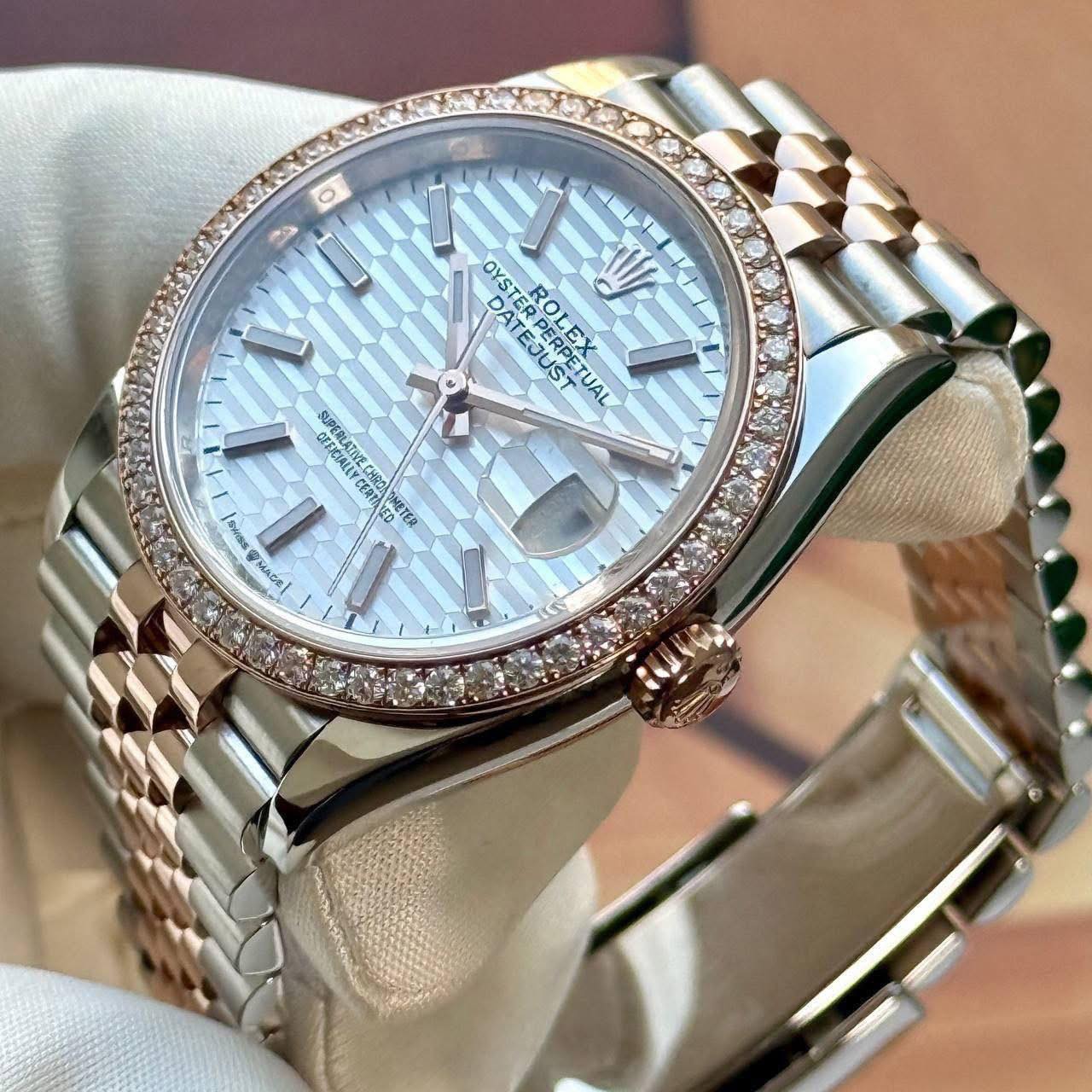 Với kích thước 36mm, đây là mẫu đồng hồ có tính linh hoạt cao — phù hợp với cổ tay từ vừa đến nhỏ, cả nam và nữ đều có thể đeo. Thiết kế demi vàng hồng phối đá kim cương khiến chiếc đồng hồ vừa có thể đeo đi làm, đi tiệc, hay thậm chí là kết hợp cùng trang phục thường ngày.